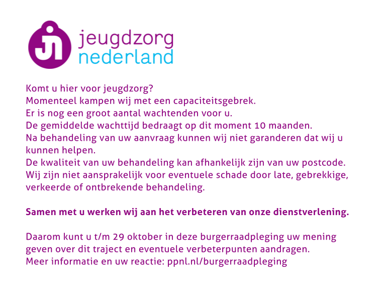 Het in 2015 – tegen de bezwaren van het werkveld in – verschuiven van jeugdzorg naar de gemeenten ging gepaard met inkrimping van de budgetten. De zorg is vaak niet adequaat, met name in de Jeugd-GGZ. De kwaliteit is afhankelijk geworden van de aanwezige expertise in de gemeenten. De onderlinge verschillen in budgetten, toegankelijkheid en kwaliteit zijn groot. Gemeentes stellen ieder afzonderlijk een zorgpakket samen; er is sprake van rechtsongelijkheid omdat de zorg afhangt van de postcode. De wachtlijsten zijn veel te lang.