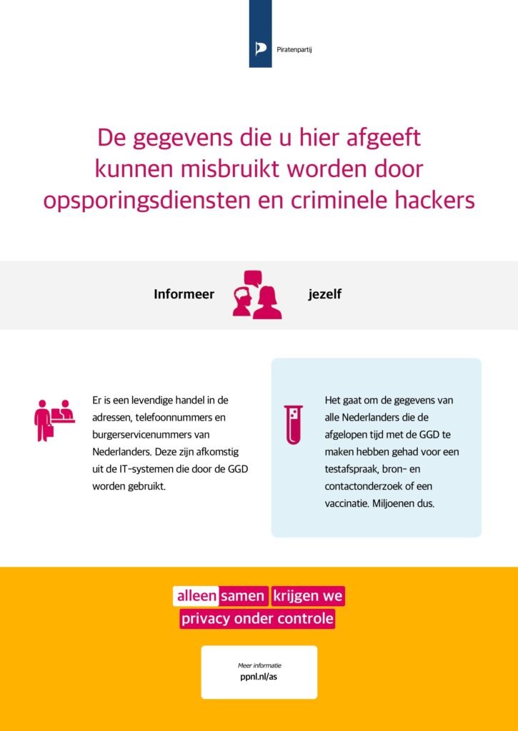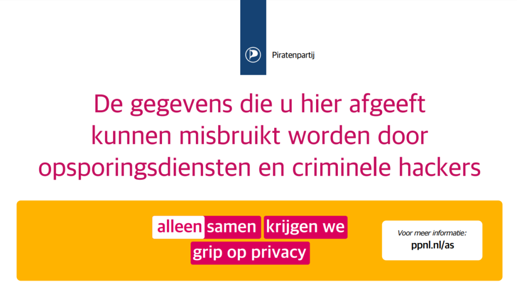 Zoals Matthijs laat zien in het filmpje, zijn er voor al die plekken speciale stickers en posters met informatie voor de nietsvermoedende burger. Voor wie wil helpen met het volplakken van data-oogstmachines: we zijn te bereiken via vrijwilligers@piratenpartij.nl om stickers te bestellen. Maar je kunt ze ook downloaden uit dit artikel. Transparantie, openheid en eerlijkheid en goede dienstverlening. Als de overheid het niet doet, doen wij het wel!