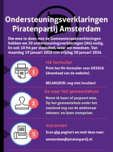 Alleen met voldoende ondersteuningsverklaringen (OSV) zetten we de Piratenpartij op het stemformulier. Een OSV heet ook wel een H4-formulier. Dit H4-formulier kan hier gedownload worden. Procedure in het kort: Neem geldig ID mee! De periode waarin je een OSV-formulier kunt invullen en ondertekenen op het gemeentehuis is van maandag 1 september tot en met maandag […]